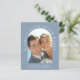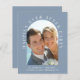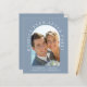Chic budget-friendly dusty blue elopement announcement and reception invitation. The front features your wedding photo in an arch frame and "Happily Ever After Party" in elegant white typography. Under your photo, add your names, wedding date and location. On the reverse side, personalise your announcement and invitation, add your names in a signature-like script and input your wedding website address to create a scannable QR code for your guests to scan to RSVP online and obtain additional details.