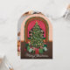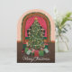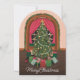 Original illustration of victorian christmas tree decorated with real candles; arched window with snow.