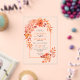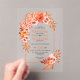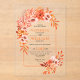 This charming fall acrylic wedding invitation features a boho arch adorned with orange flowers and autumn leaves. The design highlights an arch frame embellished with dahlias and roses in warm orange hues, complemented by lush foliage.