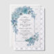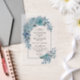 Arch with teal blue flower arrangement and leaves wedding vellum overlay invitations. These wedding invitations present a beautifully designed boho aesthetic, featuring a vellum overlay with an arch illustration. The arch is embellished with a charming flower arrangement of teal and aqua blue dahlias, roses, and leaves, creating a sophisticated and elegant design. The cool blue hues of the floral details lend a touch of refinement, making these invitations the perfect way to invite guests to your summer wedding celebration.