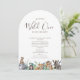 Modern arched baby shower invitation featuring six cute jungle animals and some foliage on an arched shaped invitation. The back of the invitation features the same jungle animals illustration on a very pale light blue background that could be altered.