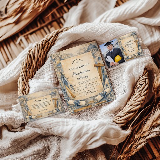 A refined architecture-inspired graduation design featuring classic blueprints, drafting tools, and elegant architectural details. The parchment-style layout paired with rulers, compasses, and scroll accents creates a timeless academic look, perfect for celebrating an architecture graduate’s achievement. Ideal for architecture students, future architects, and graduation celebrations with a sophisticated, professional aesthetic.