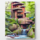 Beautiful tabletop art plaque features an AI generated digital watercolor of a F.L. Wright prairie style architectural treehouse.