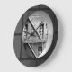 Striking architecture features a large open circle cut into a concrete wall. Through the circular window, the zigzag of the fire escape stairs of the next building are visible. A collection of mesmerising geometry is contained within and surrounding the hole in the wall: lines, angles, squares, rectangles, and triangles.