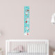 This adorable growth chart features a winter wonderland woodland with arctic foxes in santa hats, birds, snow, snowflakes and snow-capped trees. The background is a turquoise teal blue green.