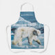 A white polar bear on the snow of the arctic winter with an iceberg in behind.