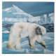 A white polar bear in the snow of the arctic winter with an iceberg in behind.