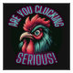 A brightly coloured rooster appears with an expression of disbelief, surrounded by the phrase "Are You Clucking Serious!" in bold lettering. The design uses vibrant colours against a dark background to create a striking and humourous effect.