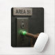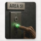 A dark brown wrinkled alien hand presses a glowing green button labelled 'Area 51' on an elevator panel, sparking curiosity about the secrets of the location