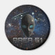 Area 51 design for Conspiracy Theorists, three UFOs and an alien head with glowing eyes.