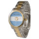 Very good quality watch that looks good whether dressing up or down. The band is sturdy. The watch is rather large so might not work for smaller folks. Recommended as a good gift. Printing is just a touch light but adds a nice touch of personalization.
