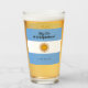 Celebrate the independence day of Argentina with this festive pint glass, which features the iconic blue and white colours of the Argentinian flag with salutations and date on the blue portions of the flag. ¡Feliz Día de la Independencia! Reverse shows identical design.