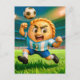 An energetic empanada character in Argentina’s striped jersey leaps upward to head a soccer ball. The illustration uses clean vector‑like lines with soft 3D shading and expressive facial features. Detailed grass and stadium lighting add a lively match atmosphere.
