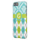 Argyle and damask pattern green, aqua monogram iPhone 6 cases. This cute, girly design features an argyle pattern in lime green, turquoise, white with black intercrossing lines and aqua white damask on the upper part. There is a green band across it and a circle with your monogram. This elegant, classy and stylish design is completely customisable. You can change background colour - turquoise and text colour choosing from over 200 colours from Zazzle colour chart. Contemporary and modern with a retro flair.