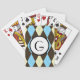 A set of playing cards featuring a round center surrounded by a turquoise, brown and white argyle pattern. Inside the center is a spot for yours or your gift recipient's initial.