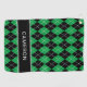 Cute custom golf towel design features a preppy black & green argyle plaid pattern with white accents. A bold black stripe has a custom template for a name or custom text. Easily tailor your design by choosing from the vast Zazzle font selection library, letting you personalise the text with a font that perfectly fits your style and vision! For custom colour requests send a message using the "message" link in this listing. Please include a link or desciption to this specific design when messaging.