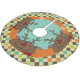 Beautiful Christmas holiday tree skirt features three cute reindeer on a background of brown, cream, aqua, orange, and mustard argyle, a strip of solid orange, and an aqua blue centre with white polka dots and snowflakes.