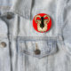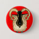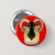 A button for someone born under the sign of Aries, with a ram, from a watercolour painting by Judy Adamson, on a bright red background.
