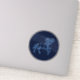 Sticker featuring the symbol for Aries in soft silver blue, overlaid with the stars of the constellation, against a starry sky background graded from deep midnight blue to black