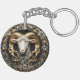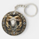 A gift for Aries: a beautiful and intricate art nouveau style personalized keychain, with a sculpted ram with gold and diamond accents. Aries symbols adorn the gems. The word "Aries" can be personalized, kept as-is, or erased.