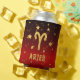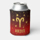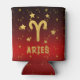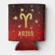 Custom coozie / can cooler for "Aries" with golden zodiac symbol, gold stars, and red and black gradient background.