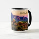 This coffee mug features an original digital painting by Karen Coffelt of a magnificent view of majestic Superstition Mountain in dusky shades of purple and blue and the town of Apache Junction, Arizona at sunset with a variety of cacti species, which includes a Saguaro cactus, cholla cacti, and barrel cactuses. Legend has it that the Dutchman Jacob Waltz hid a stash of gold in these mountains, and treasure hunters still search for it to this day. Your southwestern decor would not be complete without this poster hanging on your wall. Customize this with your name or other text using Zazzle's many different font styles and colors. Add one or more of the many fun icons that Zazzle has provided for you or customize it in the design tool by clicking or "click to customize further". Have fun making it your own! If you need any help, please don't hesitate to contact me, and I will be more than happy to assist you. You may contact me through the chat button in my Zazzle store. Thanks for looking! Original design copyright 2020 by Karen Coffelt.