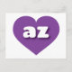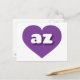 This postcard features a vibrant purple heart containing bold, rounded, white lower case letters az, a playful version of the abbreviation for Arizona, the Grand Canyon state. The reverse side of the postcard is blank awaiting your handwritten sentiments or customised text.