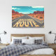 This bold graphic illustration captures the iconic feel of an endless Arizona road cutting through a vast desert landscape. Cracked yellow road lettering, dramatic red rock formations, and a striking turquoise sky create a powerful sense of solitude, freedom, and adventure. The symmetrical composition and stylized details draw the eye forward, evoking classic American road trips, Southwest travel culture, and the spirit of open highways.