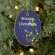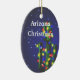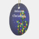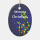 A graphic illustration of a saguaro cactus with bright Christmas lights on a Arizona Christmas ornament.