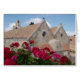 Church with pink geraniums in the foreground at Arkadi Monastery in Crete, Greece