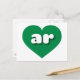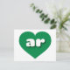 This postcard features a vibrant green heart containing the bold, white, rounded lower case letters ar, a playful abbreviation for Arkansas, the natural state. The reverse side of the postcard is blank, awaiting your handwritten sentiments or customised text.