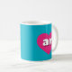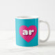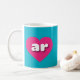 This mug features vibrant hot pink hearts containing the bold, rounded, white lower case letters ar, a playful version of the abbreviation for Arkansas, the natural state.
