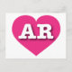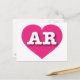 This card features a vibrant hot pink heart containing the bold, white, upper case letters AR, the official abbreviation for Arkansas, the natural state. The card is blank inside, awaiting your customised text or handwritten sentiments.