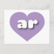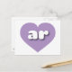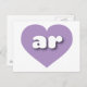 This postcard features a cool lavender heart containing bold, rounded, white lower case letters ar, a playful version of the abbreviation for Arkansas, the natural state. The reverse side of the card is blank, awaiting your handwritten sentiments or customised text.