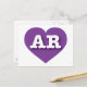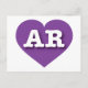 This postcard features a vibrant purple heart containing the bold, white, upper case letters AR, the official abbreviation for Arkansas, the natural state. The reverse side of the postcard is blank, awaiting your handwritten sentiments or customised text.