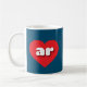 This mug features red hearts containing the bold, rounded, white lower case letters ar, a playful version of the abbreviation for Arkansas, the natural state.