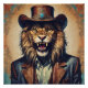 A whimsical Lion named Arlo wearing a hat, tie and roaring.