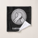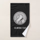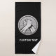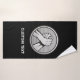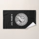 Silver round medal with two hands in arm wrestling. Custom background colour. Custom text on each towel.