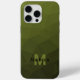Army green dark geometric mesh pattern Monogram iPhone 15 Case. Personalise with your custom initial and name. Triangle geometric mesh with light to dark Army green ombre gradient.