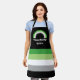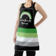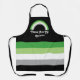 Women's apron with an image of an aromantic pride flag and a rainbow; green, white, grey, and black design on a black background, with a customisable text template for your own name or message