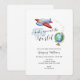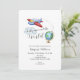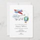 Modern Watercolor "Baby Around The World", adventure awaits, travel baby shower theme, design feture blue and red aeroplane fly over the sky decor with cloud and world globe map, this is gender neutral baby shower design, perfect for both baby boy and baby girl baby shower. you can customise your own unique text and colour.