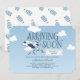 Arriving Soon: Aeroplane Baby Shower Invitation. *UPDATED SVG DESIGN* I've re-made the invitation to allow elements on the front to be re-coloured, re-positioned, etc. FRONT: A hand-drawn plane, mountains, clouds, and stars on a gradient blue background. Add the baby's name to the banner or a phrase such as "It's a boy!" Design in shades of blue and white. Text is dark bluish-grey. BACK: A carry-on suitcase pattern in coordinating colours. A whimsical and fun invitation for travelers, adventure seekers, aviation personnel, or plane-themed baby showers! © Kimbellished, LLC