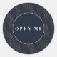 Add a touch of vintage glamour to your packages with this sophisticated Art Deco-inspired sticker in Navy Champagne palette. This circular sticker features a rich background with a repeating pattern of fine, metallic-style arches, creating a classic geometric motif. A clean, central circle frames the text "OPEN ME" in an elegant, classic serif font, making it a perfect seal for envelopes or gift boxes. Luxurious and timeless, it’s the perfect finishing touch for wedding favors, upscale branding, or any gift that deserves a grand opening.
