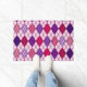 This doormat has an art deco design of diamond shapes made from overlapping angles in black lines coloured in shades of purple and pink with diagonal black lines making the design look like argyle