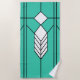 This beach towel has an art deco stained-glass window design of diamonds and lines in white, black, and turquoise.
