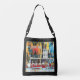 A creatively designed colourful cross body bag features an image of the Boston Swan Boats on a black background using an applied art deco filter.