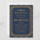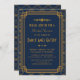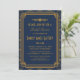 These bridal shower invitations feature a blue and gold colour palette, a geometric frame, geometric patterns, and other stylistic details all inspired by Art Deco and the roaring twenties. You can customise the sample text fields to your liking.