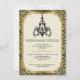 Art Deco chandelier black, gold rehearsal dinner invitation featuring a black chandelier, a border in Art Deco style and black and golden floral damask on beige/ecru. This elegant design is a modern approach to a vintage/retro style that resembles that of the Roaring 20’s and The Great Gatsby. It is part of a wedding set and is completely customisable.