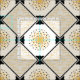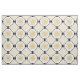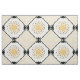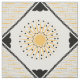 The original pattern on this custom-made fabric was created by digital artist, Leslie Sigal Javorek & inspired by 1920's Art Deco. On an off-white backdrop, the central medallion of the repeating pattern is a bright sunflower yellow stylised sunburst w/sharp angled rays. Black photo corners surrounded by a black guitar pick chain border is set on point, and in each of the 4 corners are blocks of several fine black lines alternating direction & separated by horizontal yellow sun rays.