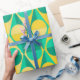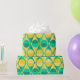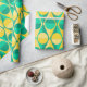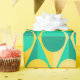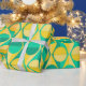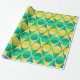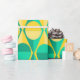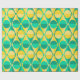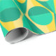 This wrapping paper has an art deco design of two-toned yellow and green circles inside two-toned yellow and green triangles.